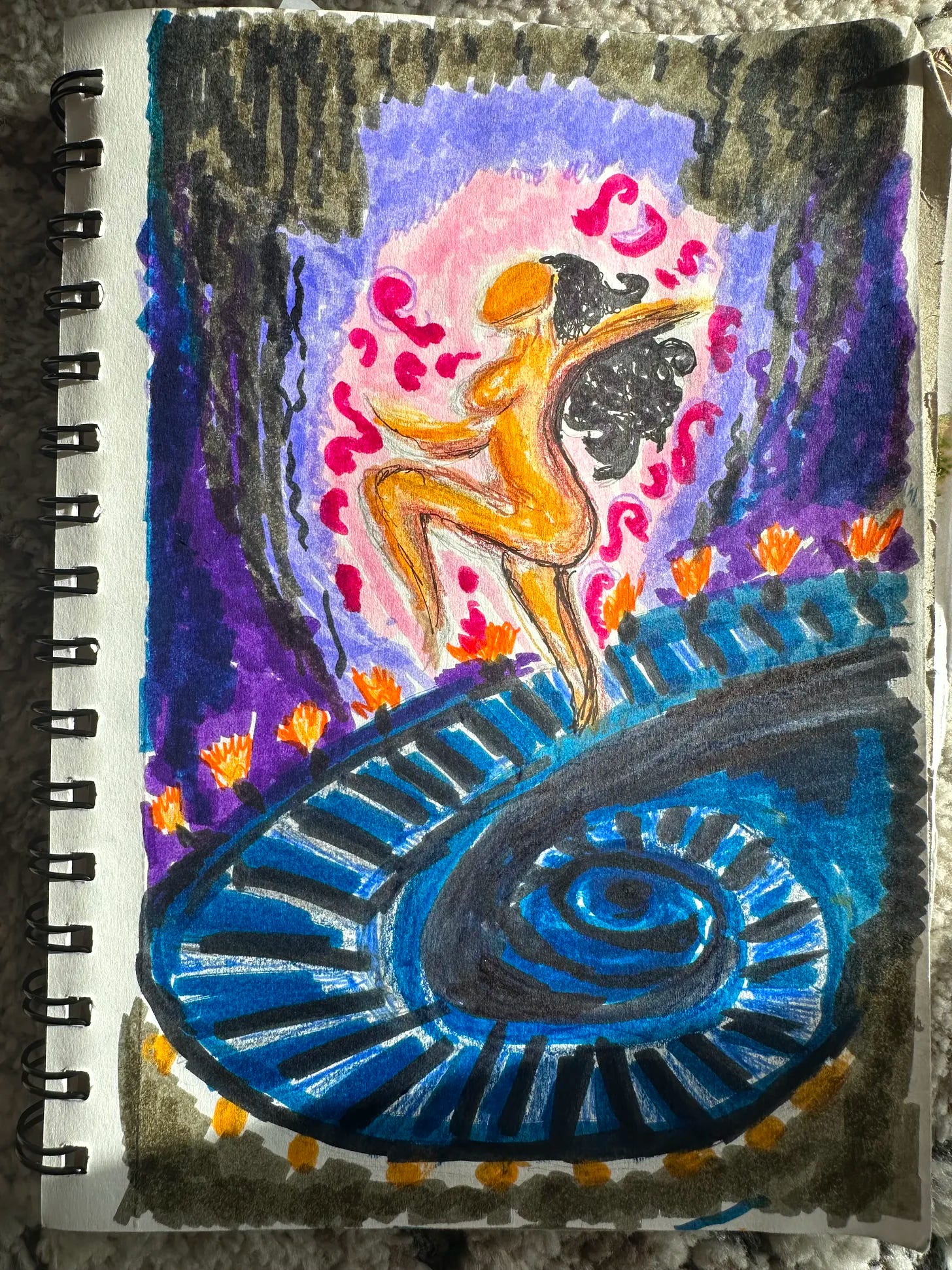 I watched myself hopping and dancing down a dark spiral tunnel, naked, lit by flame torches. Wild, exuberant, cackling. And down and down and down and down she went, the dark growing blacker, the flames growing brighter.