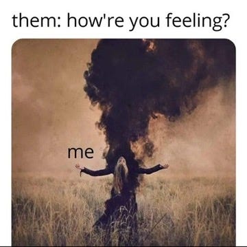 The summer after I finished business school, a time that was supposed to be peaceful and restful, ended up being a Pit of Despair. Apparently a Dark Night of the Soul can’t end without a climactic crescendo. A few days after that violent graduation sickness, daily construction started in my house all day making living let along working very challenging. While in the past I’d experienced mental health challenges in the vein of classic symptoms of depression - extreme fatigue, loneliness, sadness - I’d never experienced this kind of pain, solidly in the Red 👹🔥😫😭 zone.